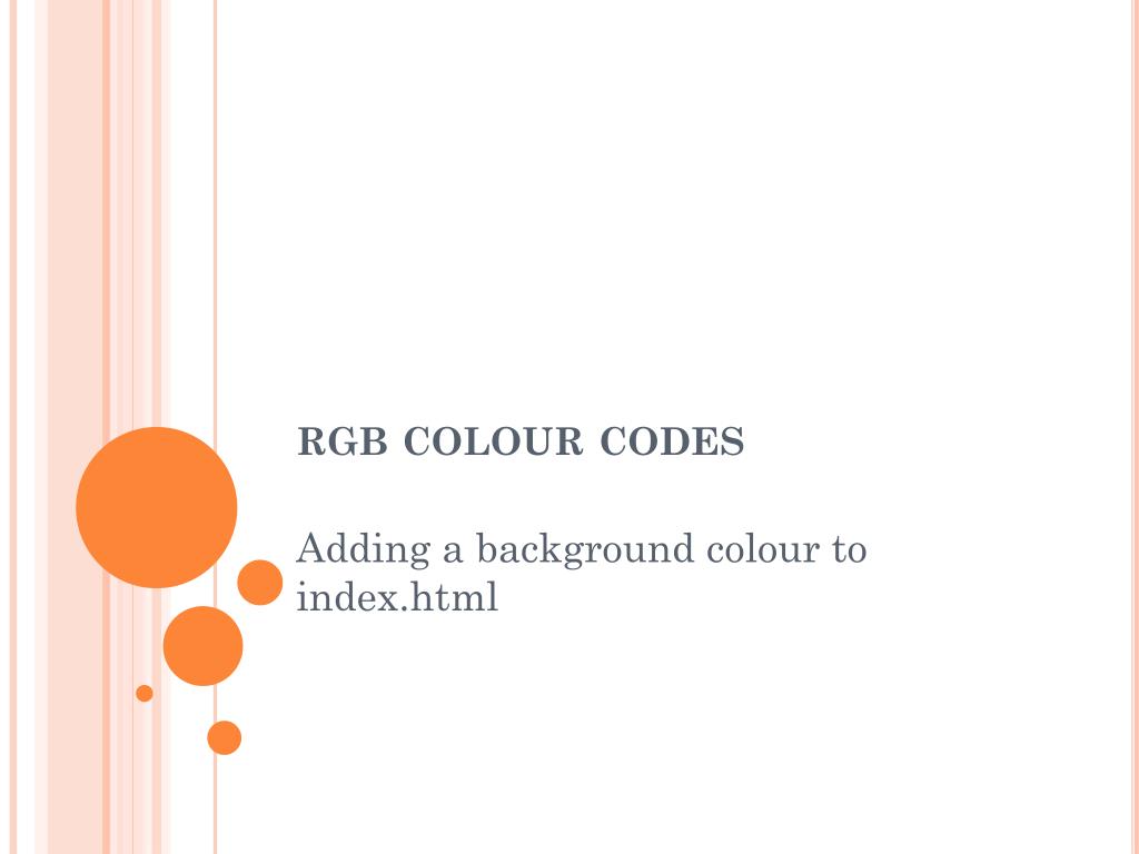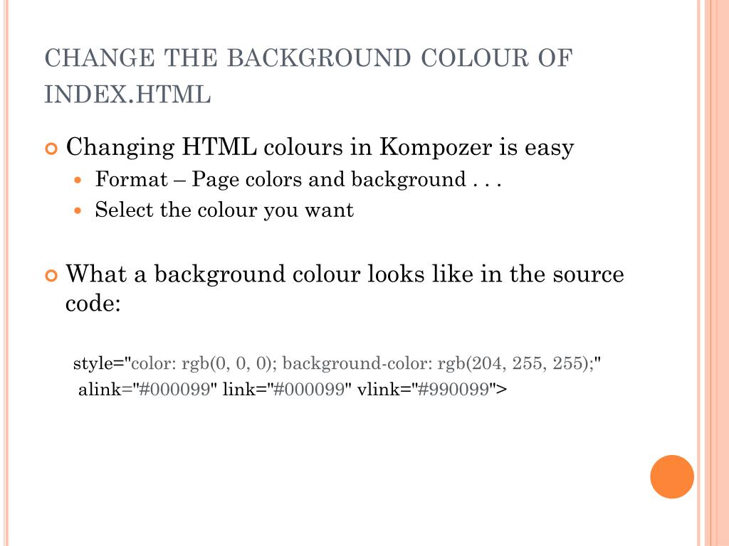 change the background colour of index.html • Changing HTML colours in Kompozer is easy • Format – Page colors and background . . . • Select the colour you want • What a background colour looks like in the source code: style="color: rgb(0, 0, 0); background-color: rgb(204, 255, 255);" alink="#000099" link="#000099" vlink="#990099">