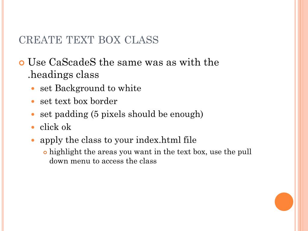create text box class • Use CaScadeS the same was as with the .headings class • set Background to white • set text box border • set padding (5 pixels should be enough) • click ok • apply the class to your index.html file • highlight the areas you want in the text box, use the pull down menu to access the class