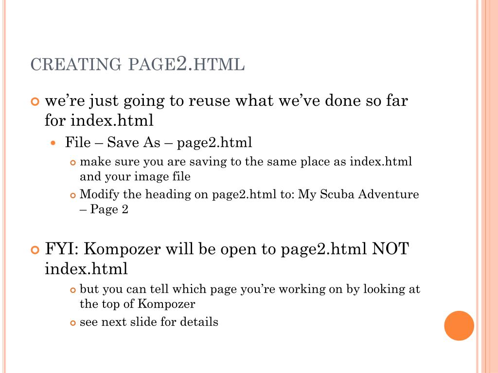 creating page2.html • we’re just going to reuse what we’ve done so far for index.html • File – Save As – page2.html • make sure you are saving to the same place as index.html and your image file • Modify the heading on page2.html to: My Scuba Adventure – Page 2 • FYI: Kompozer will be open to page2.html NOT index.html • but you can tell which page you’re working on by looking at the top of Kompozer • see next slide for details