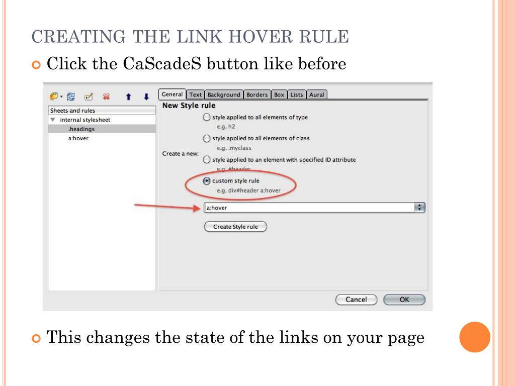 creating the link hover rule • Click the CaScadeS button like before • This changes the state of the links on your page