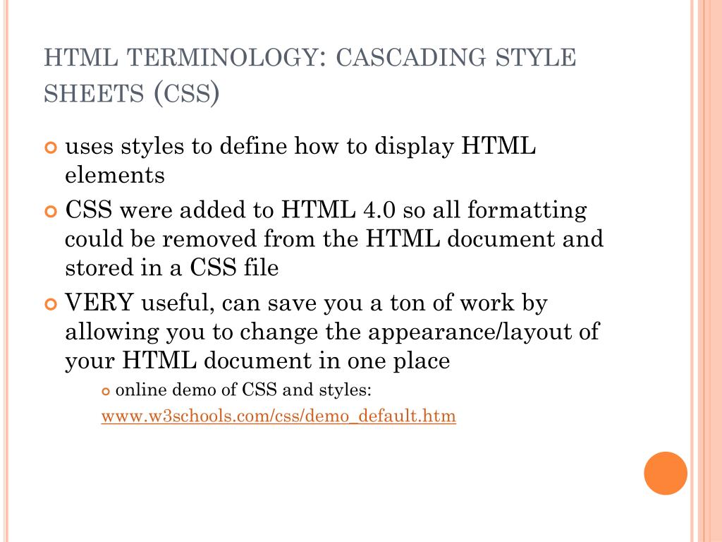 html terminology: cascading style sheets (css) • uses styles to define how to display HTML elements • CSS were added to HTML 4.0 so all formatting could be removed from the HTML document and stored in a CSS file • VERY useful, can save you a ton of work by allowing you to change the appearance/layout of your HTML document in one place • online demo of CSS and styles: www.w3schools.com/css/demo_default.htm