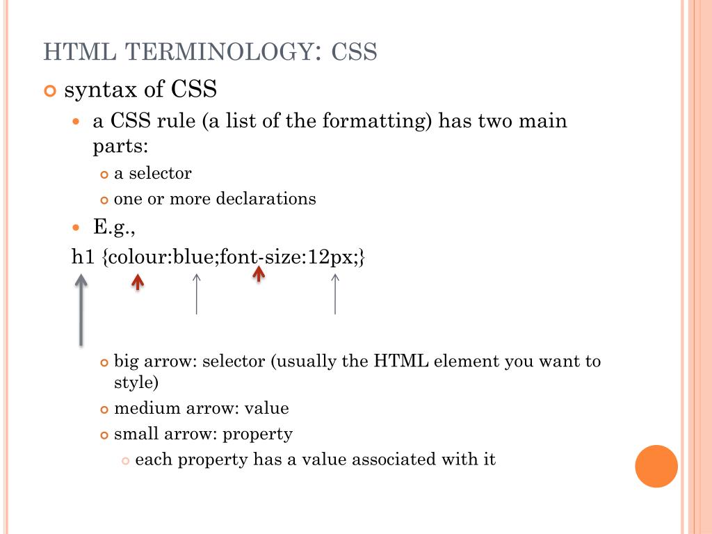 html terminology: css • syntax of CSS • a CSS rule (a list of the formatting) has two main parts: • a selector • one or more declarations • E.g., h1 {colour:blue;font-size:12px;} • big arrow: selector (usually the HTML element you want to style) • medium arrow: value • small arrow: property • each property has a value associated with it