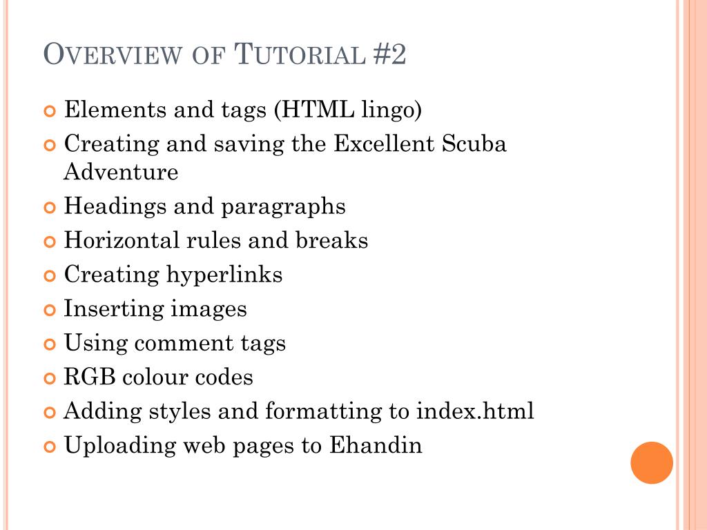Overview of Tutorial #2 • Elements and tags (HTML lingo) • Creating and saving the Excellent Scuba Adventure • Headings and paragraphs • Horizontal rules and breaks • Creating hyperlinks • Inserting images • Using comment tags • RGB colour codes • Adding styles and formatting to index.html • Uploading web pages to Ehandin