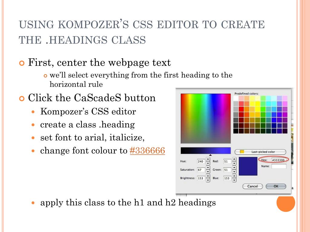 using kompozer’s css editor to create the .headings class • First, center the webpage text • we’ll select everything from the first heading to the horizontal rule • Click the CaScadeS button • Kompozer’s CSS editor • create a class .heading • set font to arial, italicize, • change font colour to #336666 • apply this class to the h1 and h2 headings