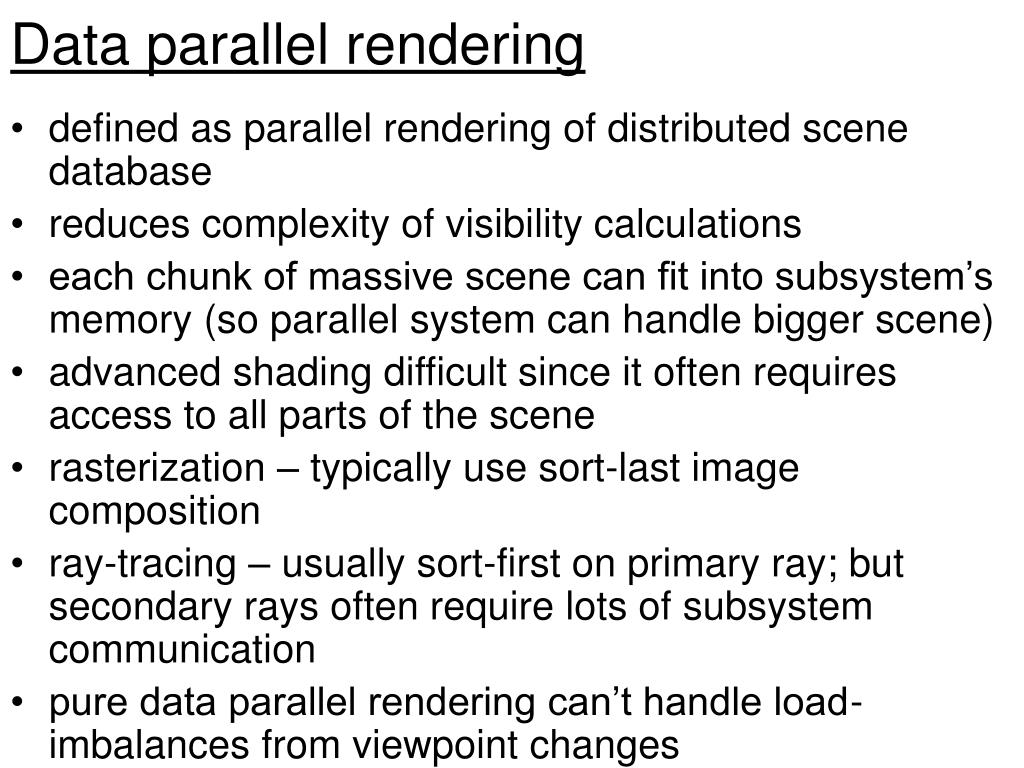 Data parallel rendering • defined as parallel rendering of distributed scene database • reduces complexity of visibility calculations • each chunk of massive scene can fit into subsystem’s memory (so parallel system can handle bigger scene) • advanced shading difficult since it often requires access to all parts of the scene • rasterization – typically use sort-last image composition • ray-tracing – usually sort-first on primary ray; but secondary rays often require lots of subsystem communication • pure data parallel rendering can’t handle load-imbalances from viewpoint changes