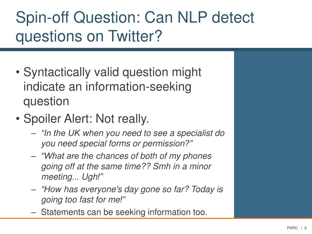 Through the Twitter Glass. Detecting Questions in Micro-text. Kyle Dent < kdent@parc.com >. Original Question: Do people use Twitter to ask questions?. First Answer: Of course. But to what extent and what kinds of questions?