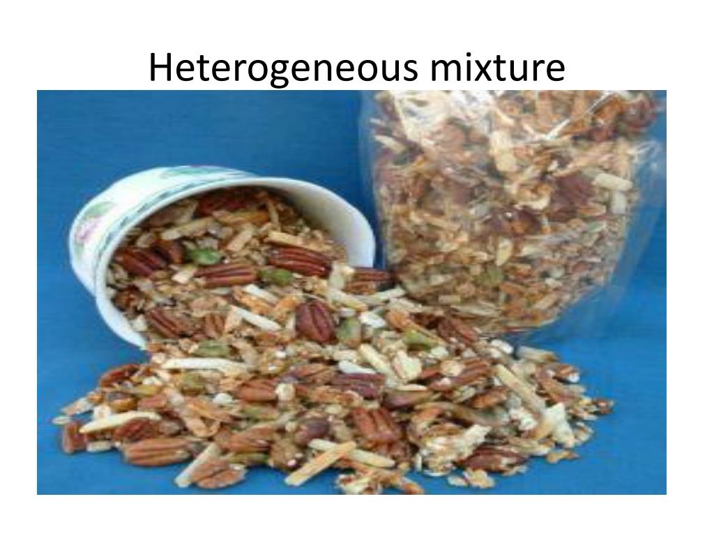 Heterogeneous and Homogeneous Mixtures • A classification of matter based on composition • Homogeneous mixture: no clumping or grouping but rather a uniform dispersal of the material it is made of. • Ex. Air; made of N2, O2, CO2 and other gases • A liquid in which there is a solvent and a solute is called a solution • Heterogeneous mixture: it is easy to identify all if the different components