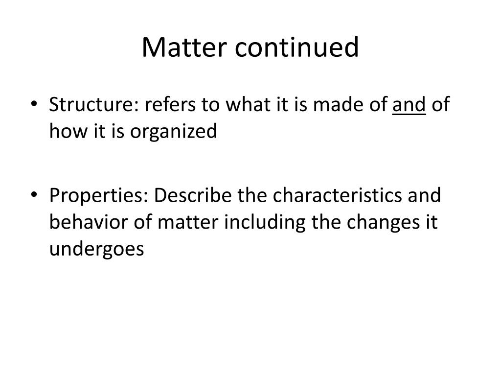 Matter continued • Structure: refers to what it is made of and of how it is organized • Properties: Describe the characteristics and behavior of matter including the changes it undergoes