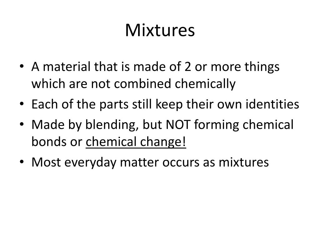 Mixtures • A material that is made of 2 or more things which are not combined chemically • Each of the parts still keep their own identities • Made by blending, but NOT forming chemical bonds or chemical change! • Most everyday matter occurs as mixtures