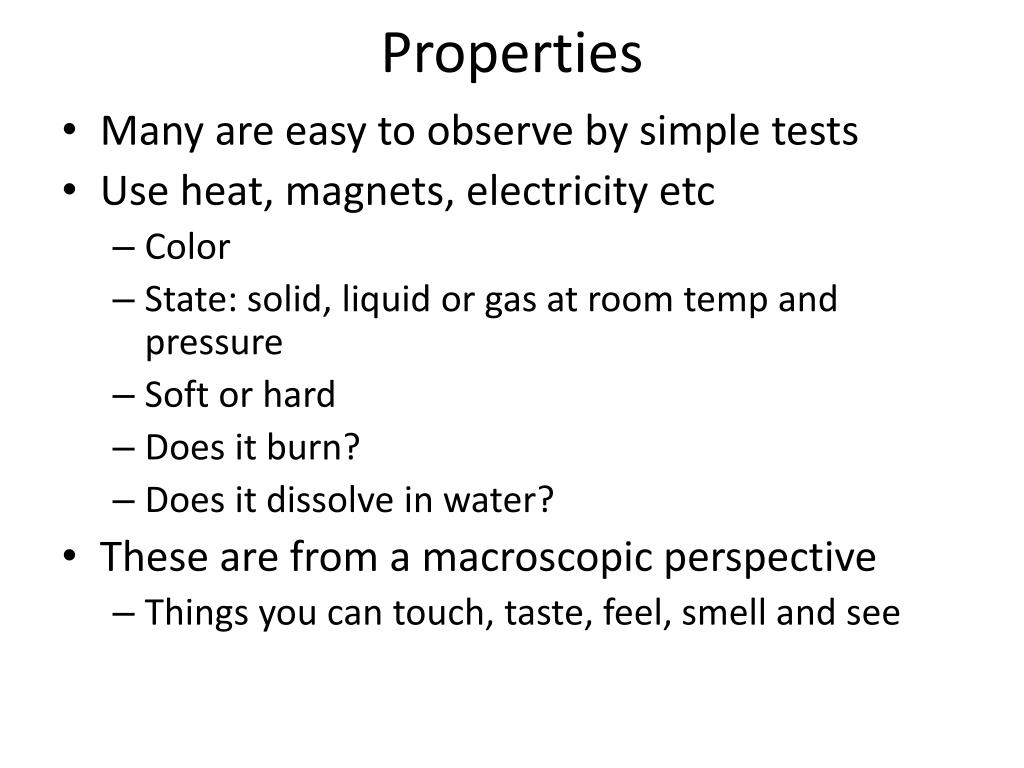 Properties • Many are easy to observe by simple tests • Use heat, magnets, electricity etc • Color • State: solid, liquid or gas at room temp and pressure • Soft or hard • Does it burn? • Does it dissolve in water? • These are from a macroscopic perspective • Things you can touch, taste, feel, smell and see