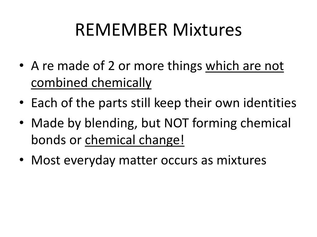 REMEMBER Mixtures • A remade of 2 or more things which are not combined chemically • Each of the parts still keep their own identities • Made by blending, but NOT forming chemical bonds or chemical change! • Most everyday matter occurs as mixtures