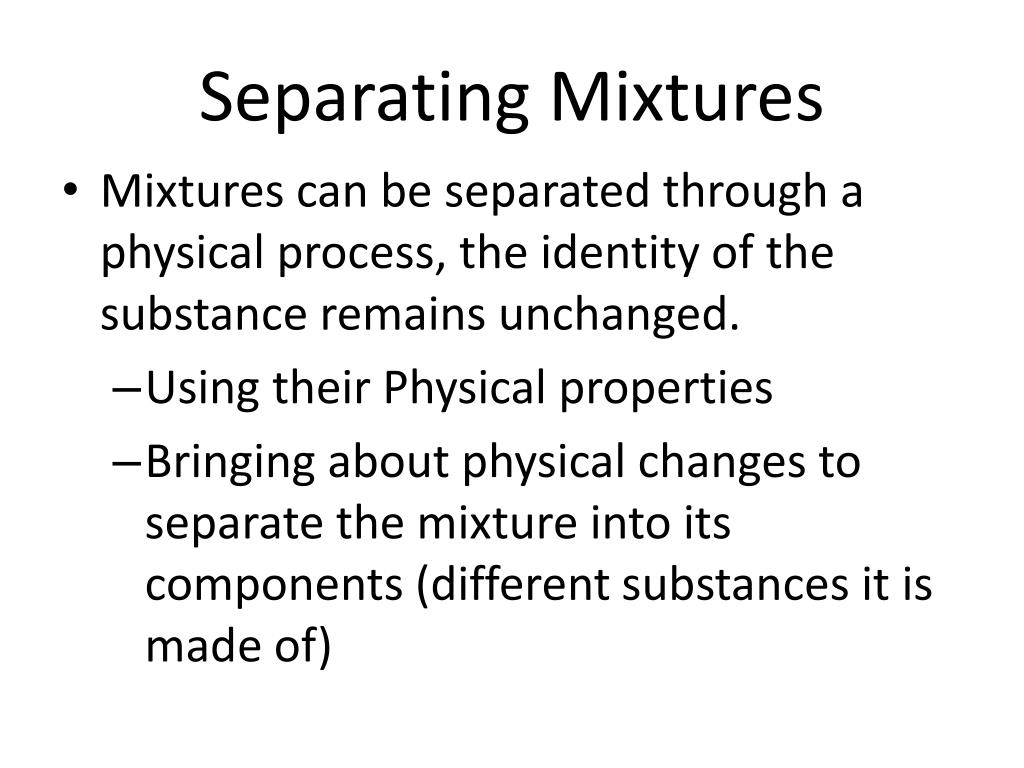 Separating Mixtures • Mixtures can be separated through a physical process, the identity of the substance remains unchanged. • Using their Physical properties • Bringing about physical changes to separate the mixture into its components (different substances it is made of)