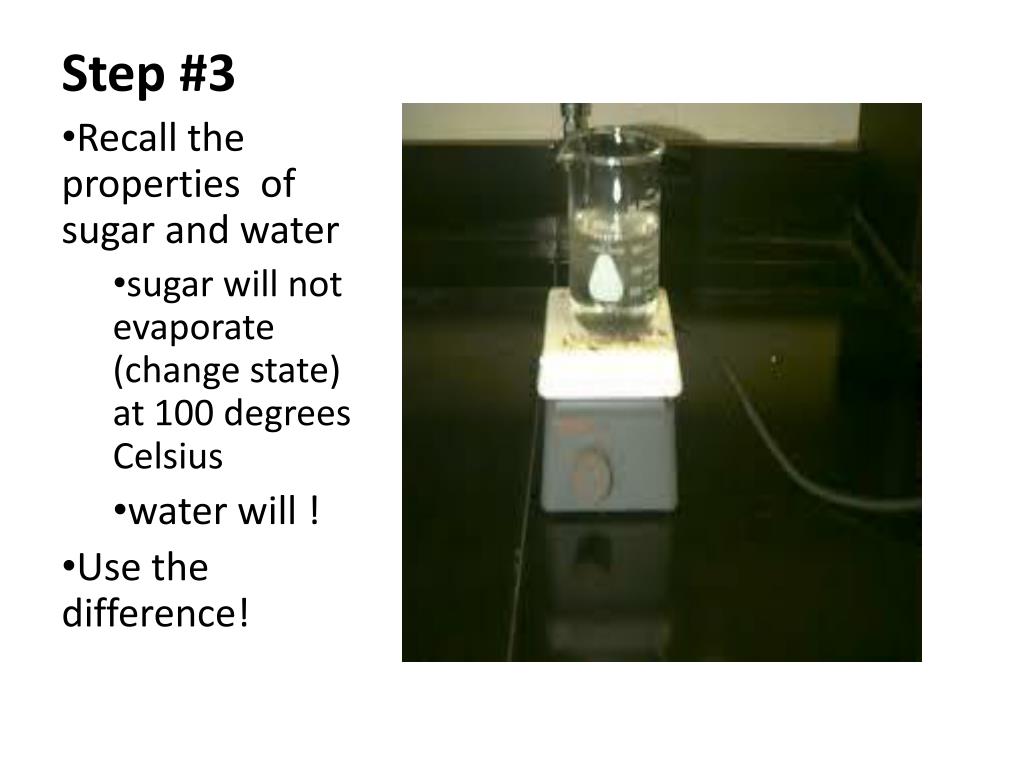 Step #3 Recall the properties of sugar and water sugar will not evaporate (change state) at 100 degrees Celsius water will ! Use the difference!