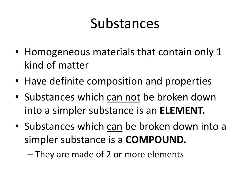 Substances • Homogeneous materials that contain only 1 kind of matter • Have definite composition and properties • Substances which can not be broken down into a simpler substance is an ELEMENT. • Substances which can be broken down into a simpler substance is a COMPOUND. • They are made of 2 or more elements