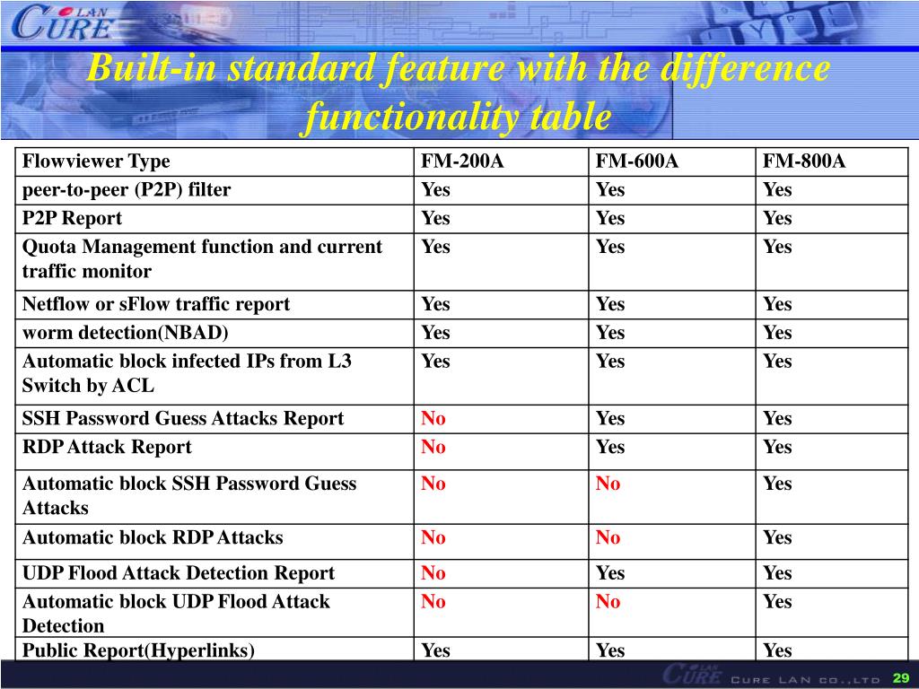 CURELAN TECHNOLOGY Co., LTD Flowviewer FM-800A. CURELAN TECHNOLOGY Co., LTD www.CureLan.com. FM-800A Main Functions. Netflow or sFlow report functions. (including P2P report) Worm Scan and P2P block functions.