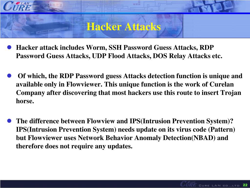 Hacker Attacks • Hacker attack includes Worm, SSH Password Guess Attacks, RDP Password Guess Attacks, UDP Flood Attacks, DOS Relay Attacks etc. • Of which, the RDP Password guess Attacks detection function is unique and available only in Flowviewer. This unique function is the work of Curelan Company after discovering that most hackers use this route to insert Trojan horse. • The difference between Flowview and IPS(Intrusion Prevention System)? IPS(Intrusion Prevention System) needs update on its virus code (Pattern) but Flowviewer uses Network Behavior Anomaly Detection(NBAD) and therefore does not require any updates.