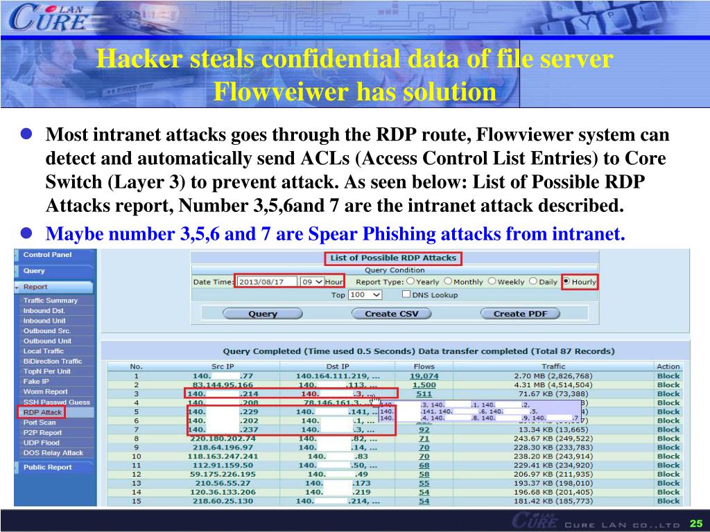 Hacker steals confidential data of file serverFlowveiwer has solution • Most intranet attacks goes through the RDP route, Flowviewer system can detect and automatically send ACLs (Access Control List Entries) to Core Switch (Layer 3) to prevent attack. As seen below: List of Possible RDP Attacks report, Number 3,5,6and 7 are the intranet attack described. • Maybe number 3,5,6 and 7 are Spear Phishing attacks from intranet.