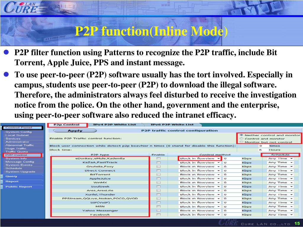 P2P function(Inline Mode) • P2P filter function using Patterns to recognize the P2P traffic, include Bit Torrent, Apple Juice, PPS andinstant message. • To use peer-to-peer (P2P) software usually has the tort involved. Especially in campus, students use peer-to-peer (P2P) to download the illegal software. Therefore, the administrators always feel disturbed to receive the investigation notice from the police. On the other hand, government and the enterprise, using peer-to-peer software also reduced the intranet efficacy.