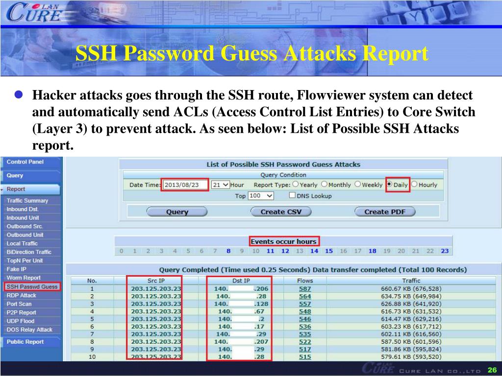 SSH Password Guess Attacks Report • Hacker attacks goes through the SSH route, Flowviewer system can detect and automatically send ACLs (Access Control List Entries) to Core Switch (Layer 3) to prevent attack. As seen below: List of Possible SSH Attacks report.
