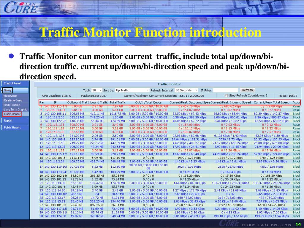 Traffic Monitor Function introduction • Traffic Monitor can monitor current traffic, include total up/down/bi-direction traffic, current up/down/bi-direction speed and peak up/down/bi-direction speed.