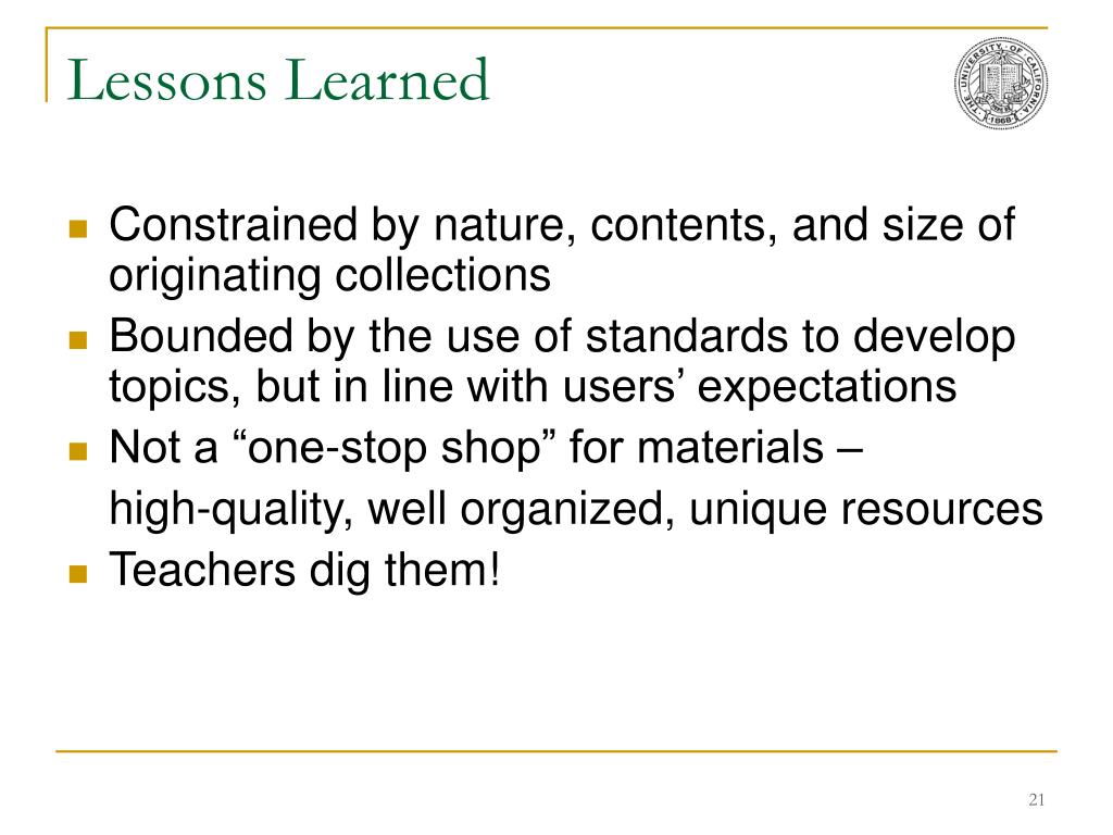 Lessons Learned • Constrained by nature, contents, and size of originating collections • Bounded by the use of standards to develop topics, but in line with users’ expectations • Not a “one-stop shop” for materials – high-quality, well organized, unique resources • Teachers dig them!