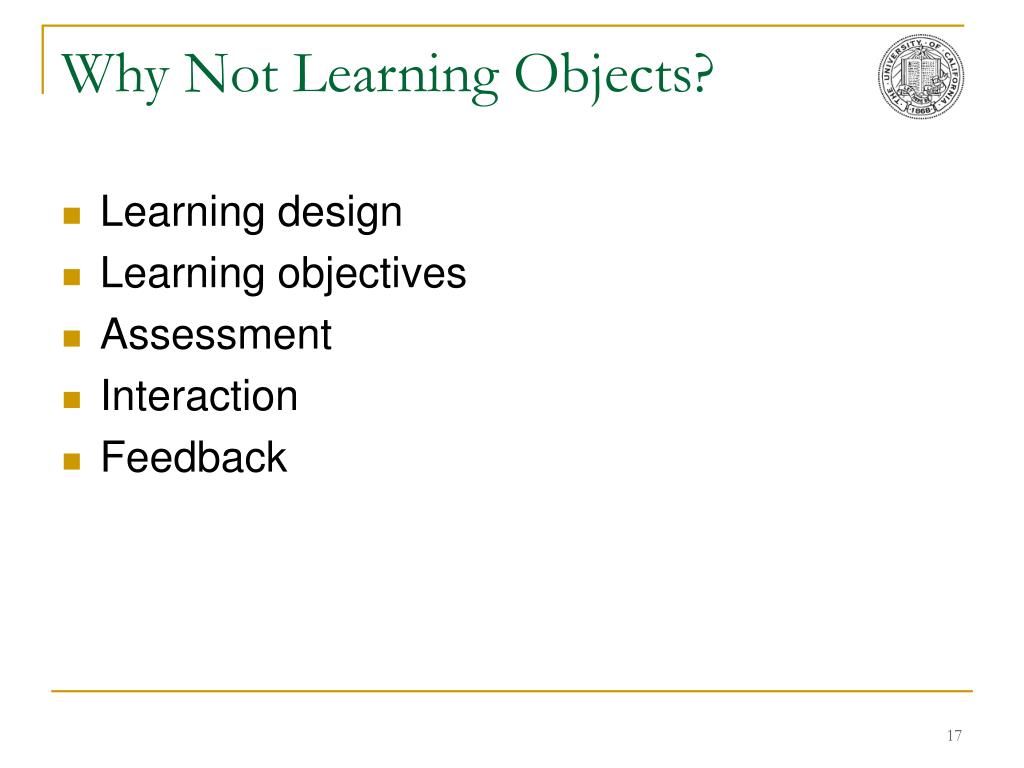 Why Not Learning Objects? • Learning design • Learning objectives • Assessment • Interaction • Feedback