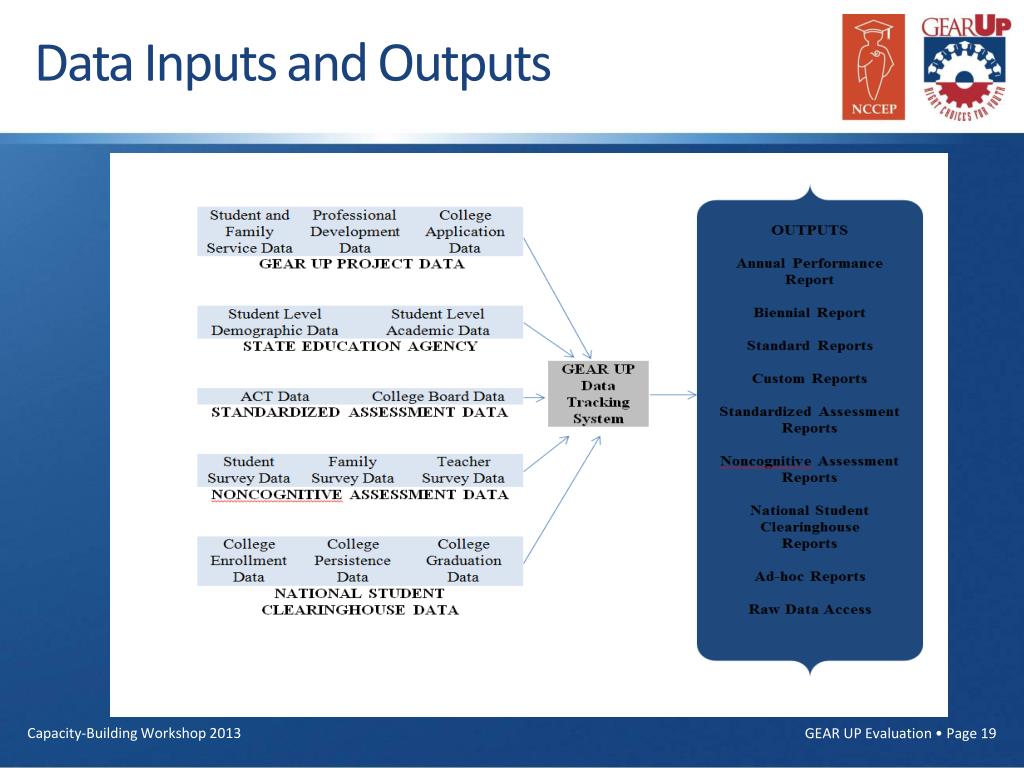 Types of Data • Baseline Data/Pre-Intervention Data • Data collected on students in target schools prior to GEAR UP intervention • Intervention Data • Data collected on students in target schools receiving the GEAR UP intervention • Post-Intervention Data • Data collected on students in target schools after the GEAR UP intervention
