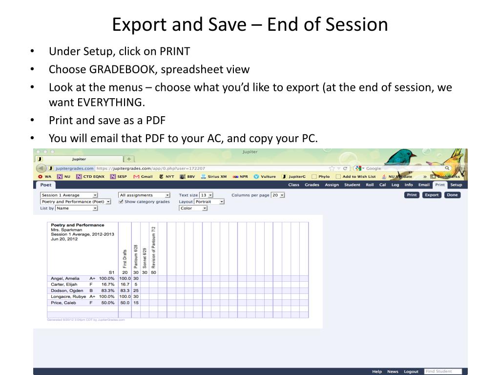Export and Save – End of Session • Under Setup, click on PRINT • Choose GRADEBOOK, spreadsheet view • Look at the menus – choose what you’d like to export (at the end of session, we want EVERYTHING. • Print and save as a PDF • You will email that PDF to your AC, and copy your PC.