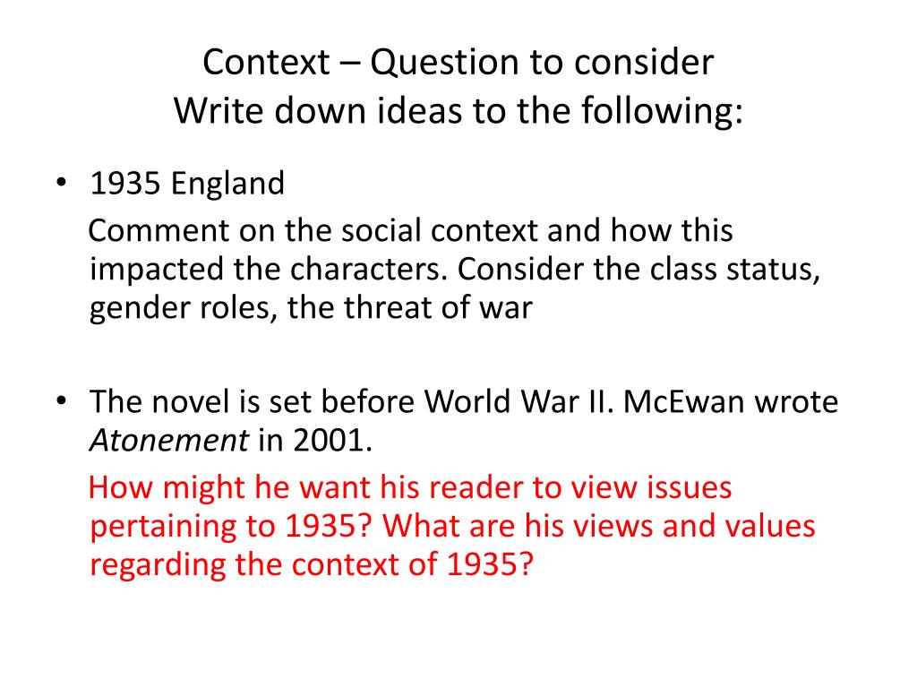 Context – Question to considerWrite down ideas to the following: • 1935 England Comment on the social context and how this impacted the characters. Consider the class status, gender roles, the threat of war • The novel is set before World War II. McEwan wrote Atonement in 2001. How might he want his reader to view issues pertaining to 1935? What are his views and values regarding the context of 1935?