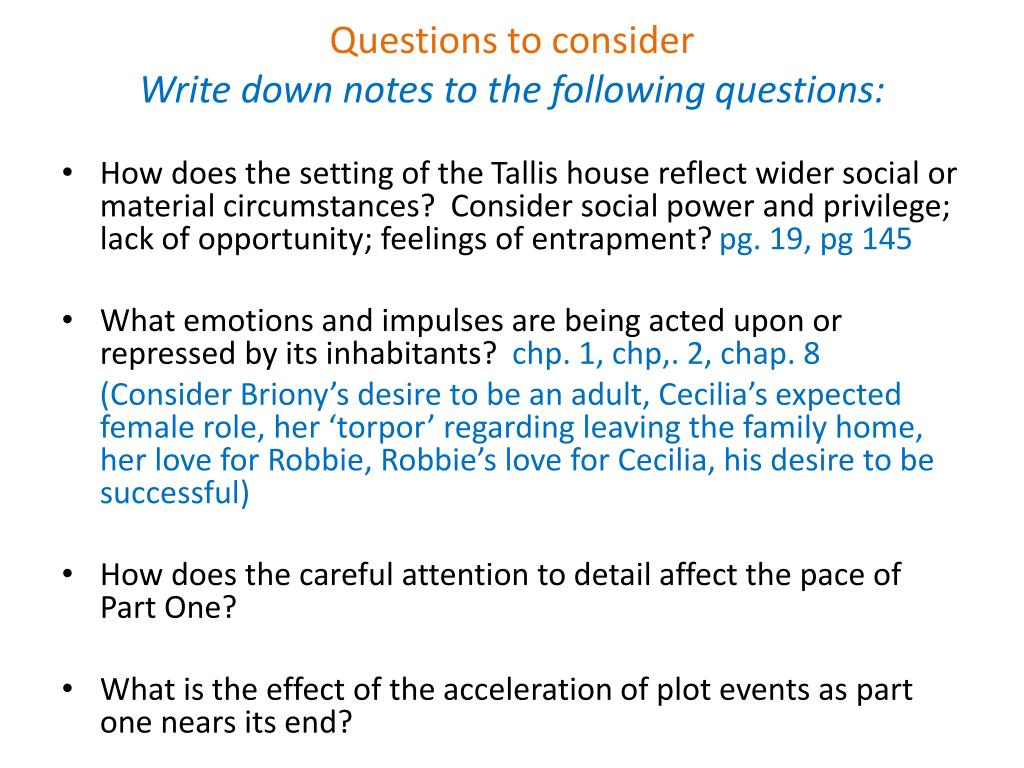 Questions to considerWrite down notes to the following questions: • How does the setting of the Tallis house reflect wider social or material circumstances? Consider social power and privilege; lack of opportunity; feelings of entrapment? pg. 19, pg 145 • What emotions and impulses are being acted upon or repressed by its inhabitants? chp. 1, chp,. 2, chap. 8 (Consider Briony’s desire to be an adult, Cecilia’s expected female role, her ‘torpor’ regarding leaving the family home, her love for Robbie, Robbie’s love for Cecilia, his desire to be successful) • How does the careful attention to detail affect the pace of Part One? • What is the effect of the acceleration of plot events as part one nears its end?