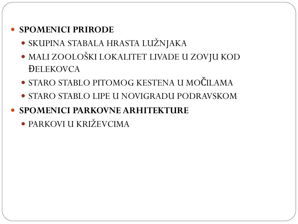 SPOMENICI PRIRODE • SKUPINA STABALA HRASTA LUŽNJAKA • MALI ZOOLOŠKI LOKALITET LIVADE U ZOVJU KOD ĐELEKOVCA • STARO STABLO PITOMOG KESTENA U MOČILAMA • STARO STABLO LIPE U NOVIGRADU PODRAVSKOM • SPOMENICI PARKOVNE ARHITEKTURE • PARKOVI U KRIŽEVCIMA
