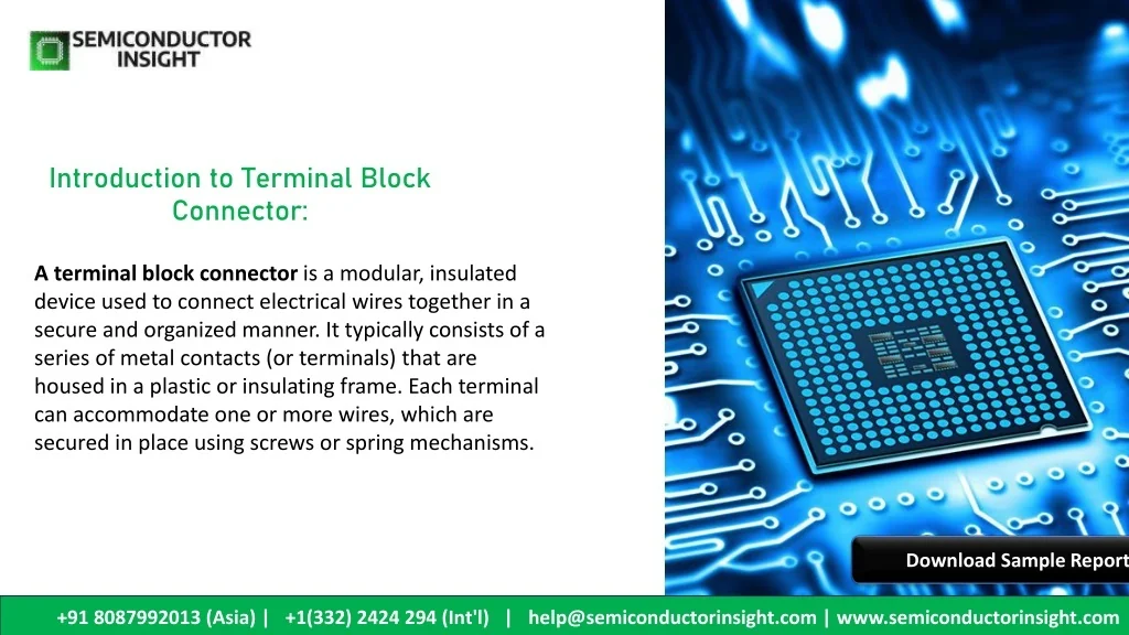 Introduction to Terminal Block Connector: A terminal block connector is a modular, insulated device used to connect electrical wires together in a secure and organized manner. It typically consists of a series of metal contacts (or terminals) that are housed in a plastic or insulating frame. Each terminal can accommodate one or more wires, which are secured in place using screws or spring mechanisms. Download Sample Report +91 8087992013 (Asia) | +1(332) 2424 294 (Int'l) | help@semiconductorinsight.com | www.semiconductorinsight.com