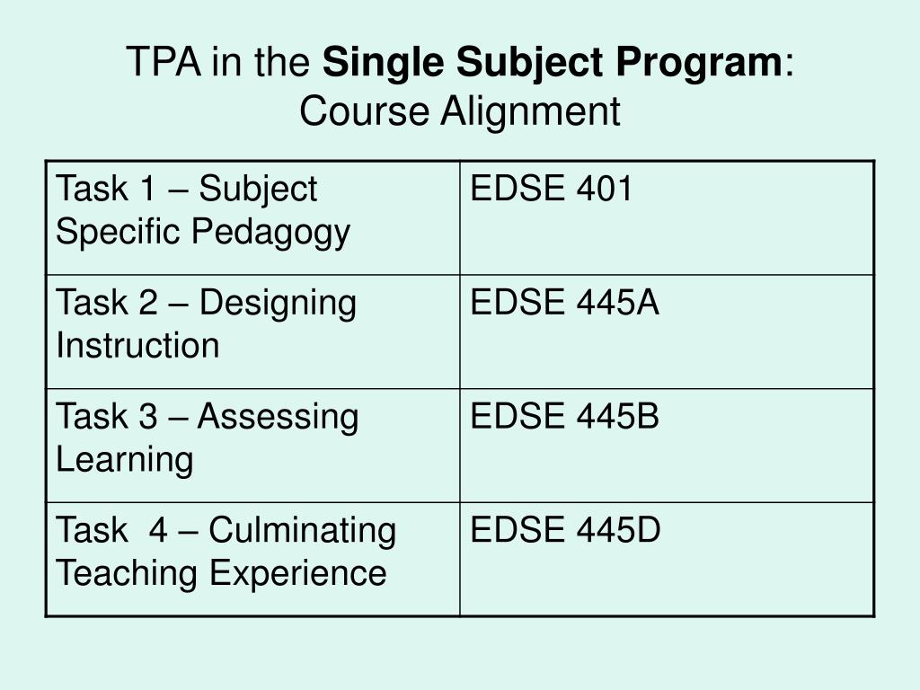 Overview of the Teaching Performance Assessment (TPA) The TPA consists of four tasks that are sequenced and increase in complexity. • Subject-Specific Pedagogy (SSP) • Designing Instruction (DI) • Assessing Learning (AL) • Culminating Teaching Experience (CTE)