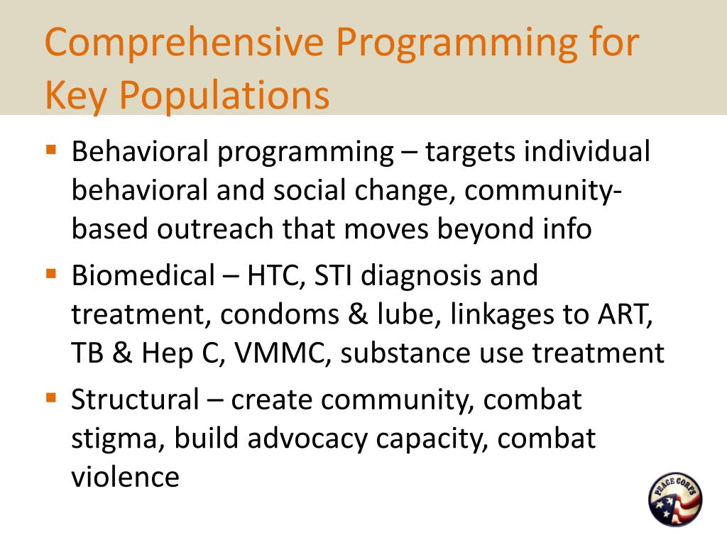 Comprehensive Programming for Key Populations • Behavioral programming – targets individual behavioral and social change, community-based outreach that moves beyond info • Biomedical – HTC, STI diagnosis and treatment, condoms & lube, linkages to ART, TB & Hep C, VMMC, substance use treatment • Structural – create community, combat stigma, build advocacy capacity, combat violence