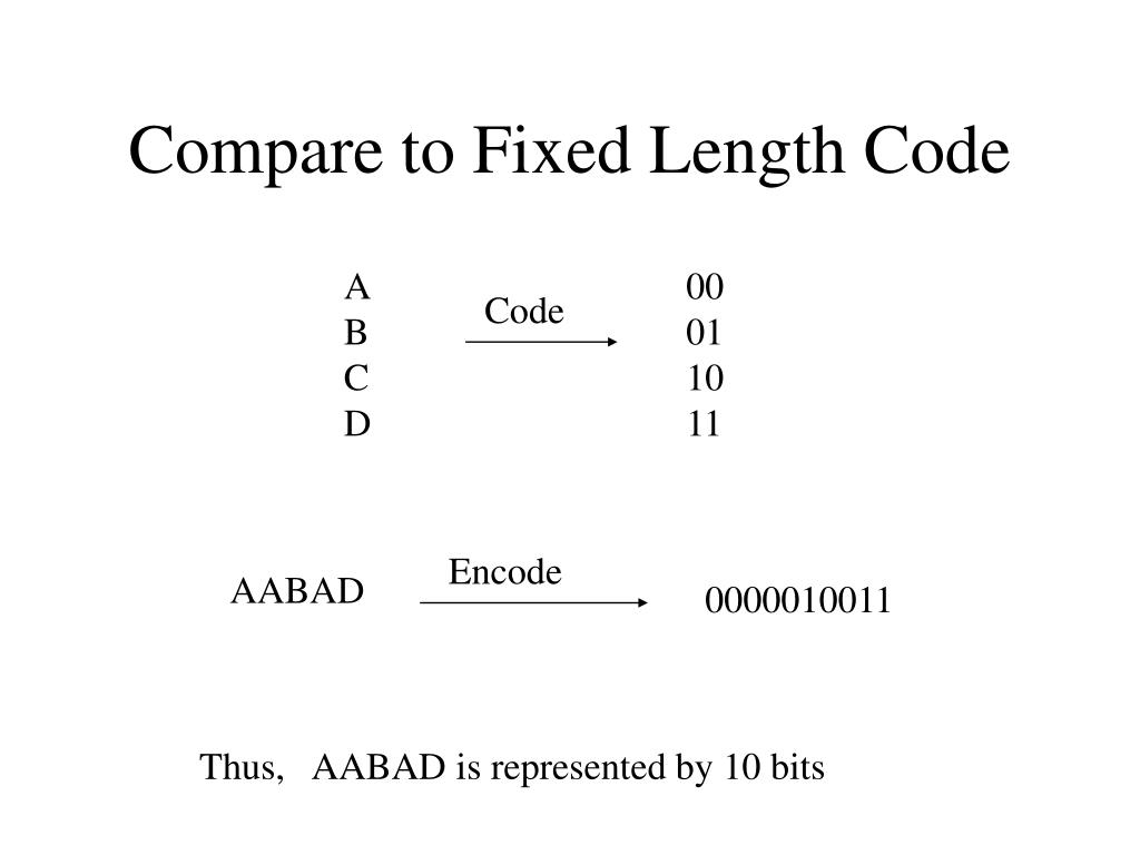 Compare to Fixed Length Code A 00 B 01 C 10 D 11 Code Encode AABAD 0000010011 Thus, AABAD is represented by 10 bits