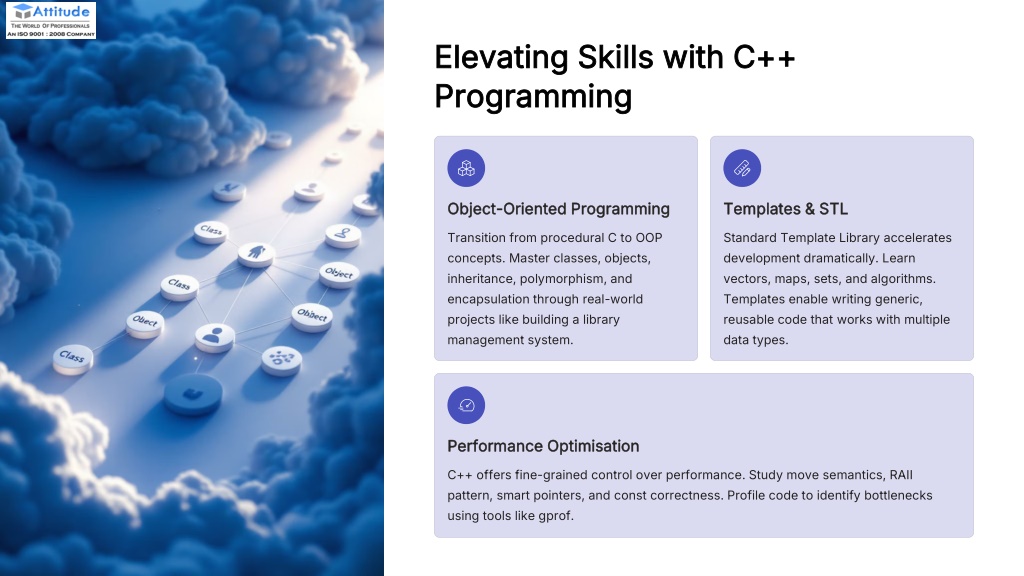 Elevating Skills with C++ Programming Object-Oriented Programming Templates & STL Transition from procedural C to OOP concepts. Master classes, objects, inheritance, polymorphism, and encapsulation through real-world projects like building a library management system. Standard Template Library accelerates development dramatically. Learn vectors, maps, sets, and algorithms. Templates enable writing generic, reusable code that works with multiple data types. Performance Optimisation C++ offers fine-grained control over performance. Study move semantics, RAII pattern, smart pointers, and const correctness. Profile code to identify bottlenecks using tools like gprof.
