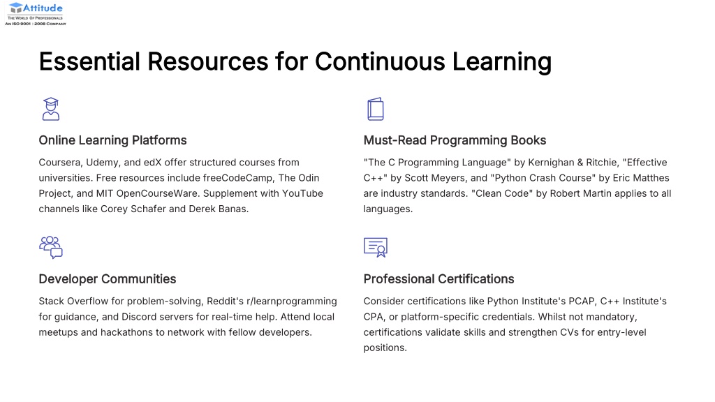 Essential Resources for Continuous Learning Online Learning Platforms Must-Read Programming Books Coursera, Udemy, and edX offer structured courses from universities. Free resources include freeCodeCamp, The Odin Project, and MIT OpenCourseWare. Supplement with YouTube channels like Corey Schafer and Derek Banas. "The C Programming Language" by Kernighan & Ritchie, "Effective C++" by Scott Meyers, and "Python Crash Course" by Eric Matthes are industry standards. "Clean Code" by Robert Martin applies to all languages. Developer Communities Professional Certifications Stack Overflow for problem-solving, Reddit's r/learnprogramming for guidance, and Discord servers for real-time help. Attend local meetups and hackathons to network with fellow developers. Consider certifications like Python Institute's PCAP, C++ Institute's CPA, or platform-specific credentials. Whilst not mandatory, certifications validate skills and strengthen CVs for entry-level positions.
