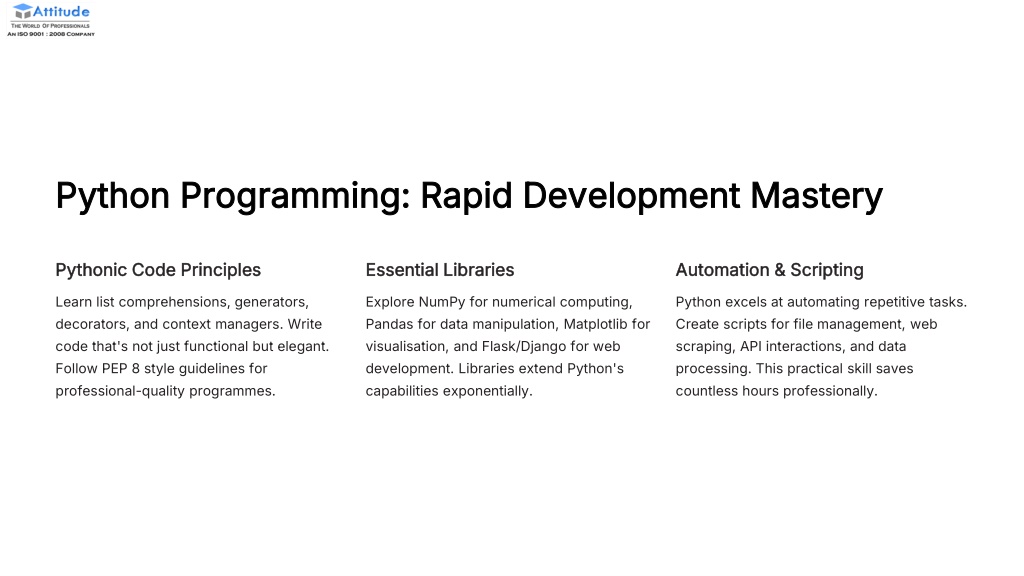 Python Programming: Rapid Development Mastery Pythonic Code Principles Essential Libraries Automation & Scripting Learn list comprehensions, generators, decorators, and context managers. Write code that's not just functional but elegant. Follow PEP 8 style guidelines for professional-quality programmes. Explore NumPy for numerical computing, Pandas for data manipulation, Matplotlib for visualisation, and Flask/Django for web development. Libraries extend Python's capabilities exponentially. Python excels at automating repetitive tasks. Create scripts for file management, web scraping, API interactions, and data processing. This practical skill saves countless hours professionally.