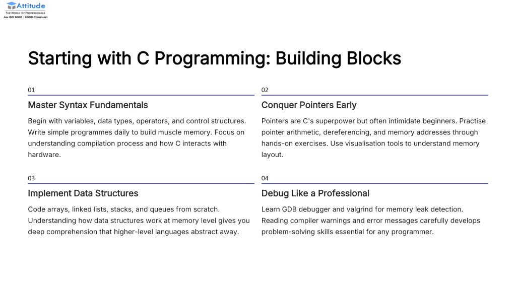 Starting with C Programming: Building Blocks 01 02 Master Syntax Fundamentals Conquer Pointers Early Begin with variables, data types, operators, and control structures. Write simple programmes daily to build muscle memory. Focus on understanding compilation process and how C interacts with hardware. Pointers are C's superpower but often intimidate beginners. Practise pointer arithmetic, dereferencing, and memory addresses through hands-on exercises. Use visualisation tools to understand memory layout. 03 04 Implement Data Structures Debug Like a Professional Code arrays, linked lists, stacks, and queues from scratch. Understanding how data structures work at memory level gives you deep comprehension that higher-level languages abstract away. Learn GDB debugger and valgrind for memory leak detection. Reading compiler warnings and error messages carefully develops problem-solving skills essential for any programmer.