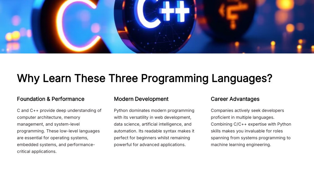 Why Learn These Three Programming Languages? Foundation & Performance Modern Development Career Advantages C and C++ provide deep understanding of computer architecture, memory management, and system-level programming. These low-level languages are essential for operating systems, embedded systems, and performance-critical applications. Python dominates modern programming with its versatility in web development, data science, artificial intelligence, and automation. Its readable syntax makes it perfect for beginners whilst remaining powerful for advanced applications. Companies actively seek developers proficient in multiple languages. Combining C/C++ expertise with Python skills makes you invaluable for roles spanning from systems programming to machine learning engineering.