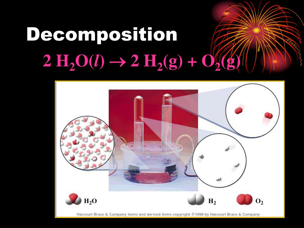Decomposition • one reactant breaks apart into two or more elements or compounds. • Usually requires heat or electricity • A catalyst may be used to speed up the reaction • The decomposition of a substance by electricity is called electrolysis