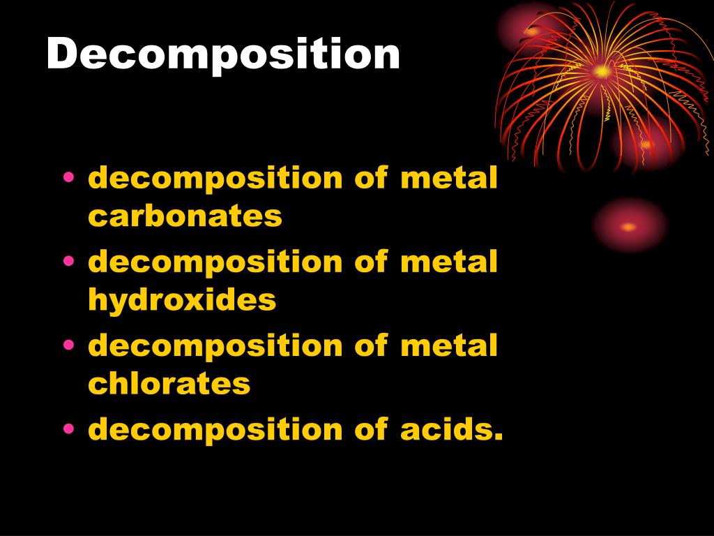 Decomposition • decomposition of metal carbonates • decomposition of metal hydroxides • decomposition of metal chlorates • decomposition of acids.