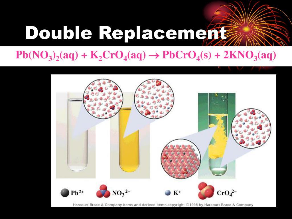 Double Replacement Pb(NO3)2(aq) + K2CrO4(aq) PbCrO4(s) + 2KNO3(aq)
