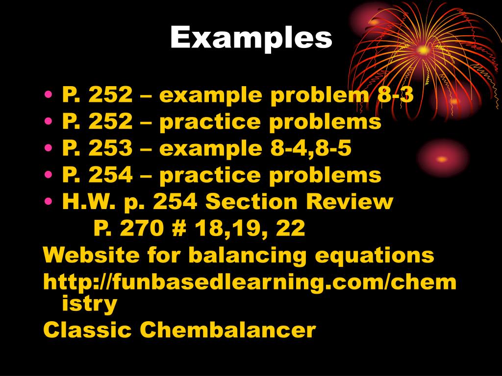 Examples • P. 252 – example problem 8-3 • P. 252 – practice problems • P. 253 – example 8-4,8-5 • P. 254 – practice problems • H.W. p. 254 Section Review P. 270 # 18,19, 22 Website for balancing equations http://funbasedlearning.com/chemistry Classic Chembalancer