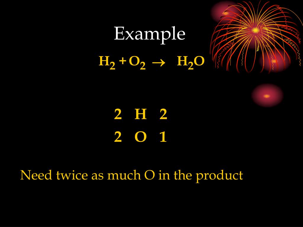 Example H2 + O2 ® H2O 2 H 2 2 O 1 Need twice as much O in the product