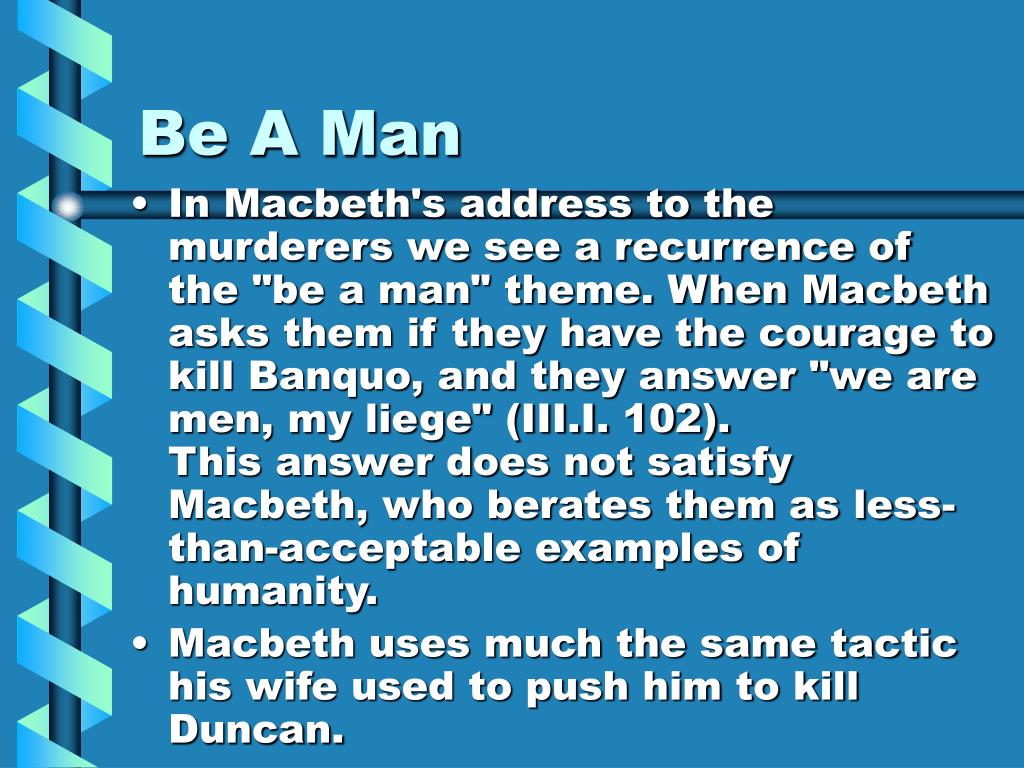2. Be A Man • In Macbeth's address to the murderers we see a recurrence of the "be a man" theme. When Macbeth asks them if they have the courage to kill Banquo, and they answer "we are men, my liege" (III.I. 102). This answer does not satisfy Macbeth, who berates them as less-than-acceptable examples of humanity. • Macbeth uses much the same tactic his wife used to push him to kill Duncan.