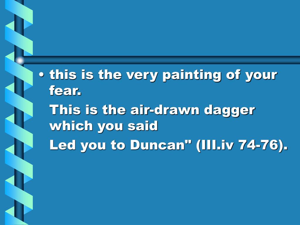 12. this is the very painting of your fear. This is the air-drawn dagger which you said Led you to Duncan" (III.iv 74-76).
