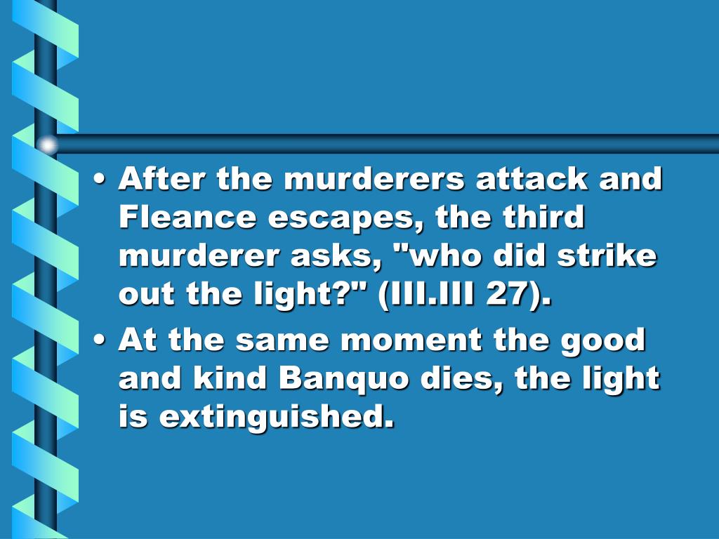 9. After the murderers attack and Fleance escapes, the third murderer asks, "who did strike out the light?" (III.III 27). • At the same moment the good and kind Banquo dies, the light is extinguished.