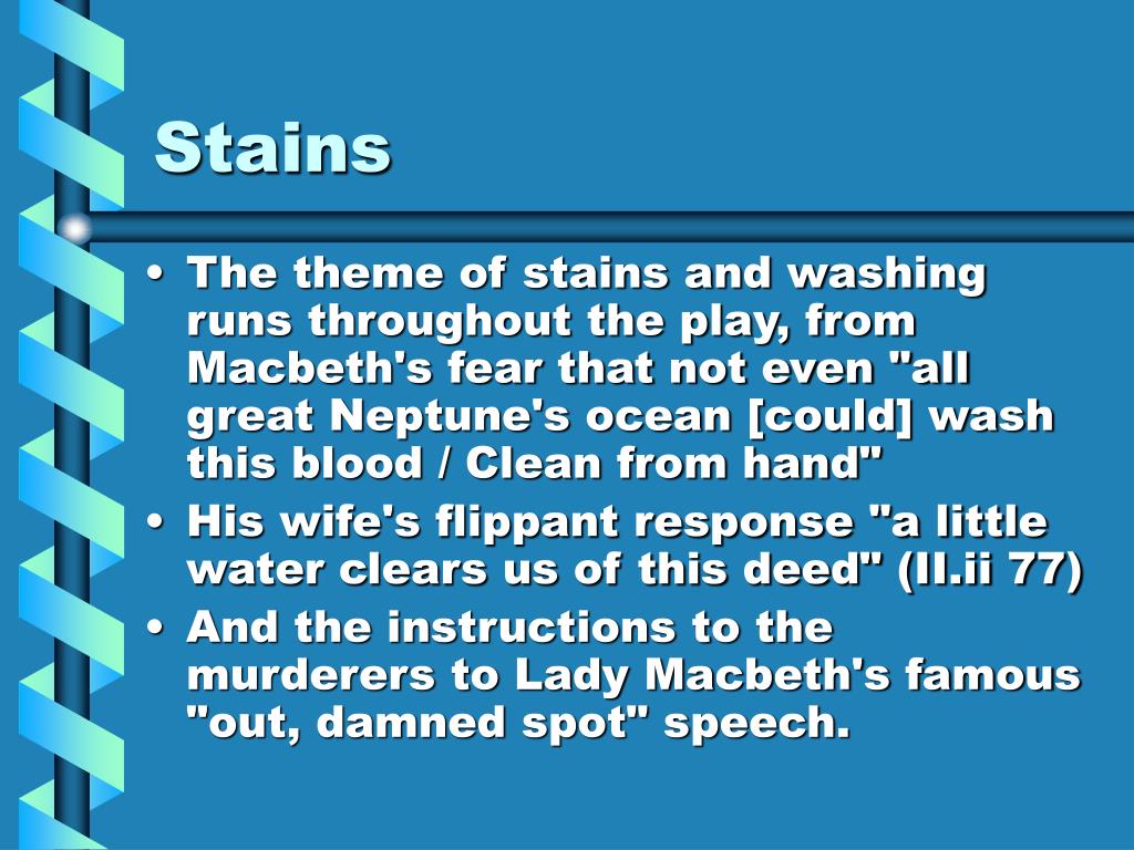 5. Stains • The theme of stains and washing runs throughout the play, from Macbeth's fear that not even "all great Neptune's ocean [could] wash this blood / Clean from hand" • His wife's flippant response "a little water clears us of this deed" (II.ii 77) • And the instructions to the murderers to Lady Macbeth's famous "out, damned spot" speech.