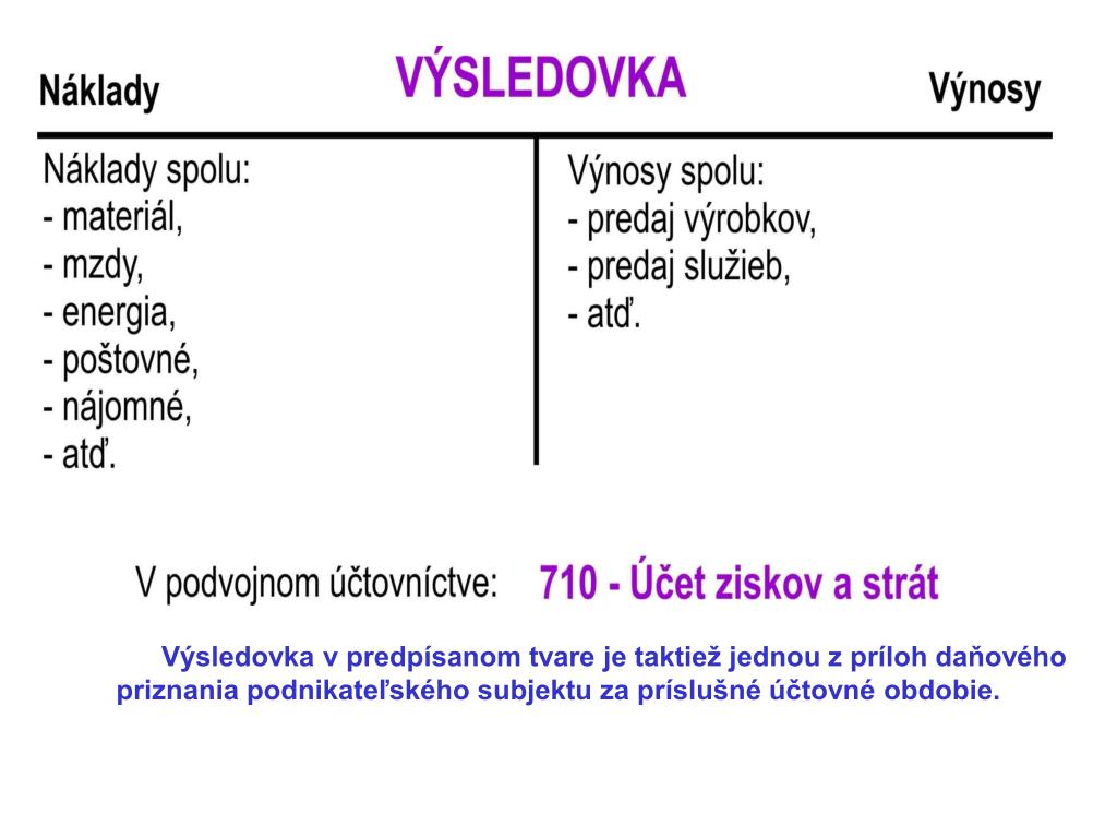 Výsledovka • V procese podnikania vznikajú náklady a vytvárajú sa výnosy. • Vznik nákladov- nákup materiálu, mzdové náklady, poistenie, atď. • Vytvorenie výnosov – predaj výrobkov, poskytnutie služieb, atď. • Hospodárske výsledky podnikateľského subjektu sú priaznivé vtedy, keď sú výnosy väčšie ako náklady – vtedy je vytvorený zisk. • V podvojnom účtovníctve je hospodársky výsledok vyjadrený vo výsledovke – zobrazenie je na následovnom obrázku.